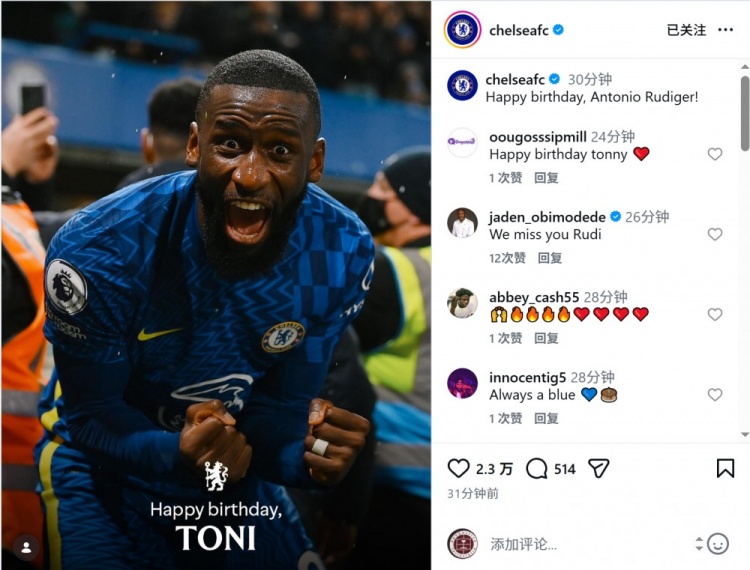 3月3日讯 今天是德国中卫吕迪格的33岁生日,老东家切尔西为他庆生。